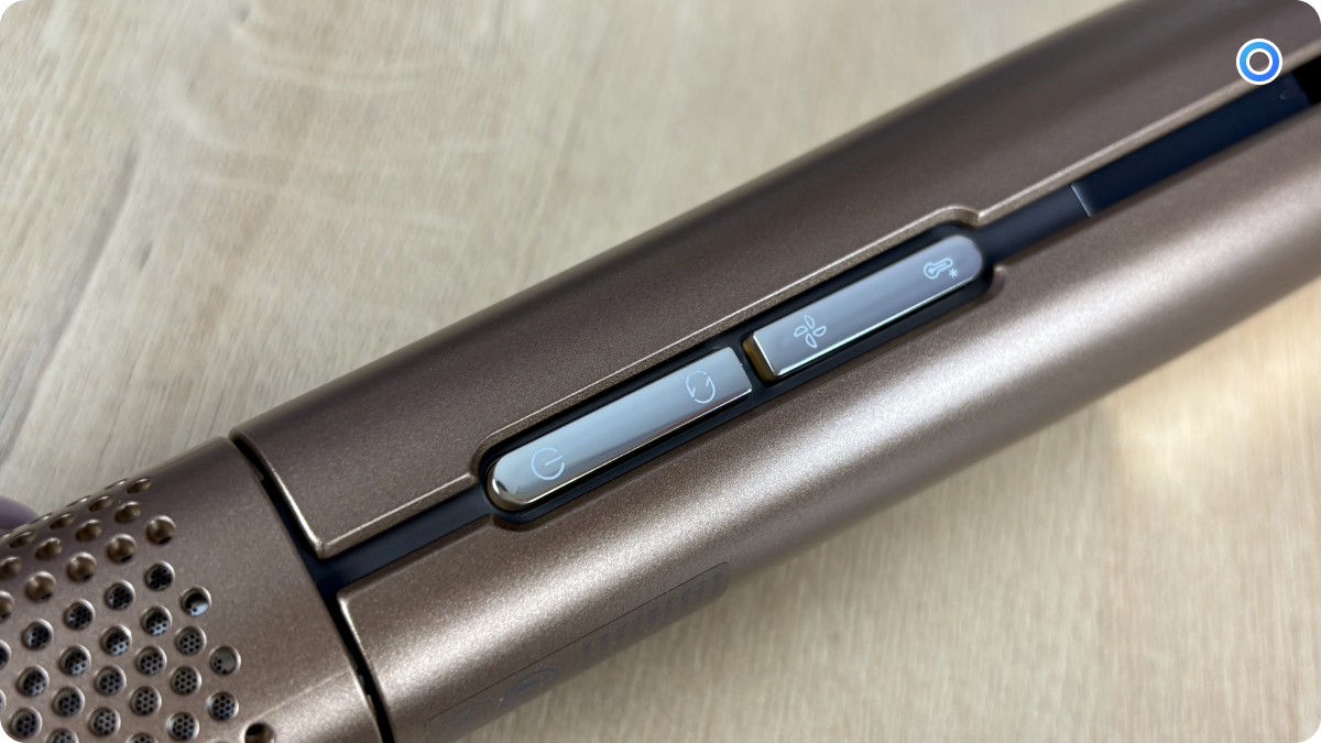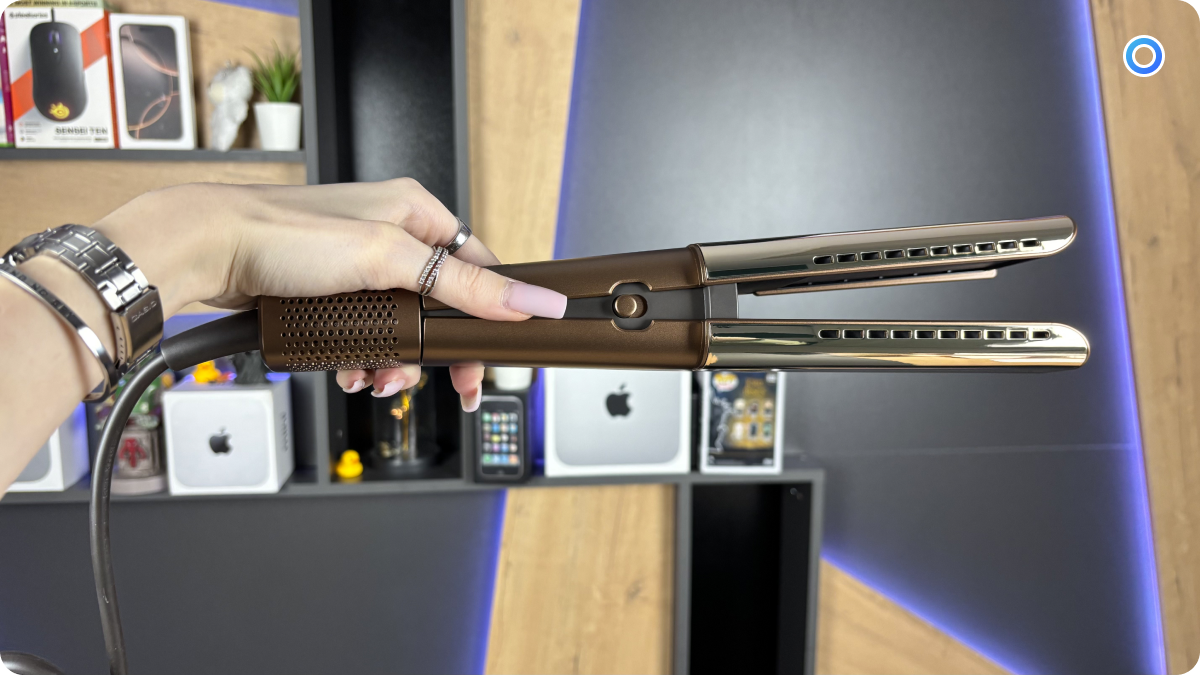 Главная идея — воздушное выпрямление. Внутри установлен двигатель с частотой вращения 110 000 об/мин, который создаёт поток воздуха до 50 м/с. Воздух проходит через серию отверстий вдоль пластин и равномерно сушит и разглаживает прядь. В отличие от обычных утюжков, волосы не зажимаются между горячими поверхностями, а выравниваются направленным потоком — бережно и без перегрева. Температура контролируется восемью датчиками NTC, которые делают более 200 измерений в секунду. Это позволяет сохранить естественную структуру волос и предотвратить пересушивание.