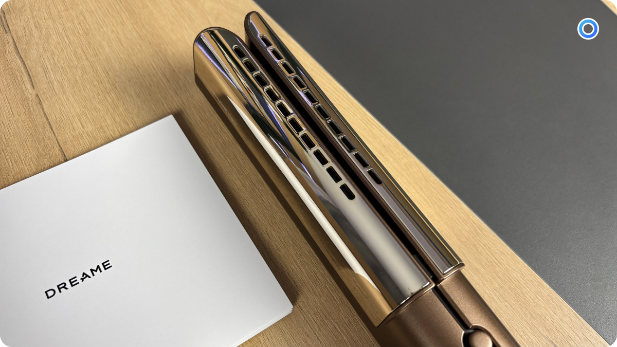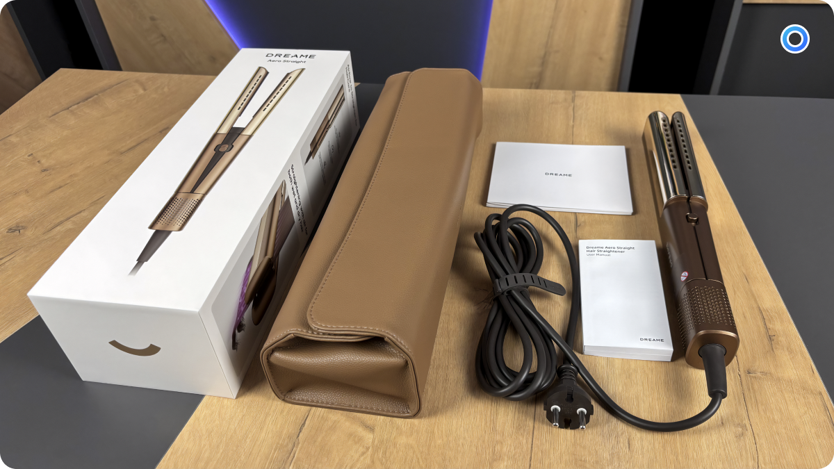 Dreame Aero Straight выглядит как премиальный аксессуар, а не бытовой прибор. Корпус в золотисто-бронзовом тоне, мягкое матовое покрытие и плавные линии создают ощущение дорогого гаджета. Всё собрано аккуратно: ничего не люфтит, не греется и не скользит. Вес ощутимый — около полкило, но благодаря сбалансированной развесовке прибор удобно лежит в руке. Провод длинный, гибкий, не закручивается, а футляр в комплекте позволяет хранить устройство аккуратно, как салонный инструмент.