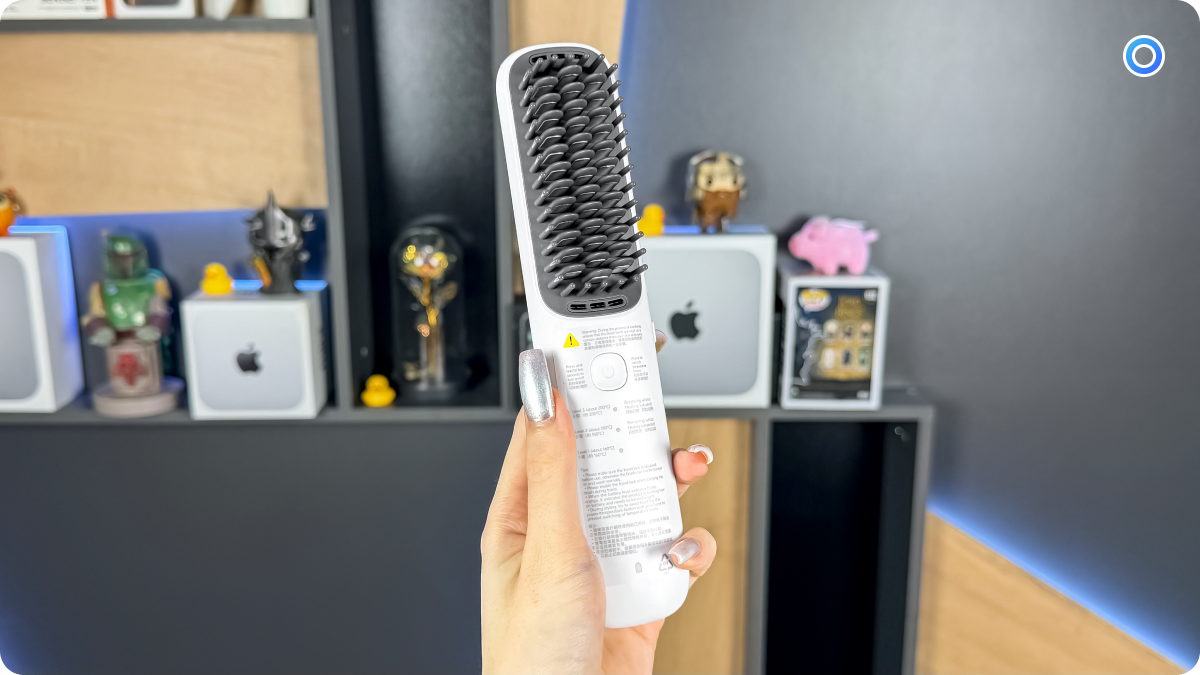 Внешне мало похоже на привычные утюжки. Это компактная расческа с плотным рядом зубчиков и системой нагрева, скрытой под корпусом. Отверстия для горячего воздуха расположены вокруг щетинок сверху и снизу, поэтому волосы прогреваются мягко, без прямого контакта с металлическими пластинами. Корпус лёгкий, слегка матовый, удобно лежит в руке и не скользит, а вес всего 269 грамм позволяет носить устройство в сумке каждый день. Боковой ползунок блокировки защищает гаджет от случайного включения в дороге или в чемодане.
