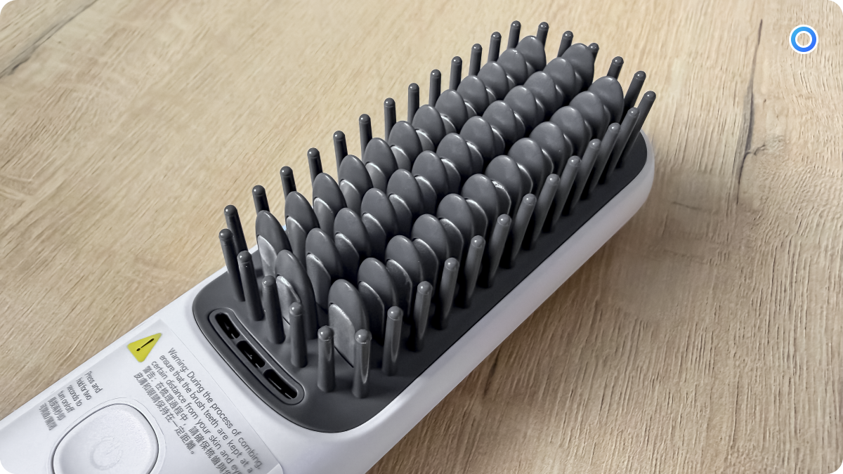 Внешне мало похоже на привычные утюжки. Это компактная расческа с плотным рядом зубчиков и системой нагрева, скрытой под корпусом. Отверстия для горячего воздуха расположены вокруг щетинок сверху и снизу, поэтому волосы прогреваются мягко, без прямого контакта с металлическими пластинами. Корпус лёгкий, слегка матовый, удобно лежит в руке и не скользит, а вес всего 269 грамм позволяет носить устройство в сумке каждый день. Боковой ползунок блокировки защищает гаджет от случайного включения в дороге или в чемодане.
