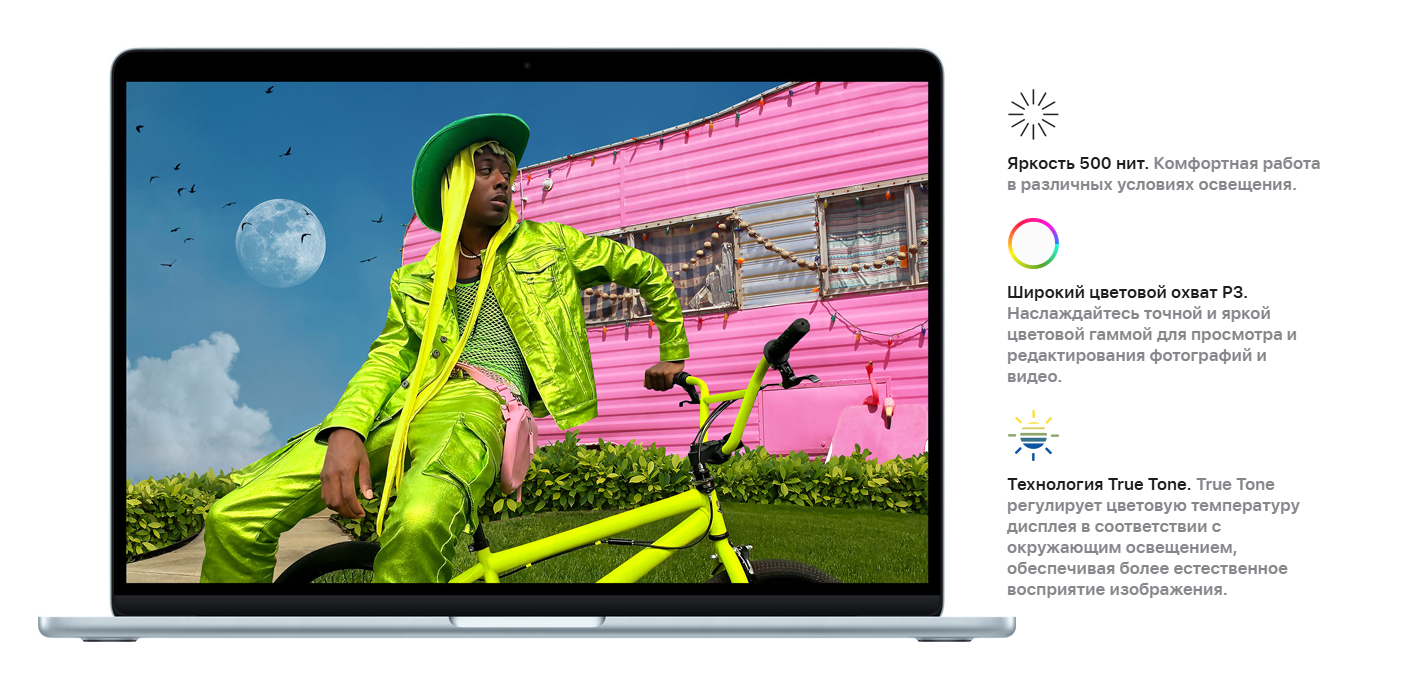 MacBook Air оснащен веб-камерой 12 Мп, встроенным микрофоном и стереодинамиками, поэтому хорошо подходит для видеозвонков, онлайн-обучения, общения и просмотра контента. Подсветка клавиш делает работу удобнее в темное время суток, а сканер отпечатка пальца помогает быстро и безопасно входить в систему.