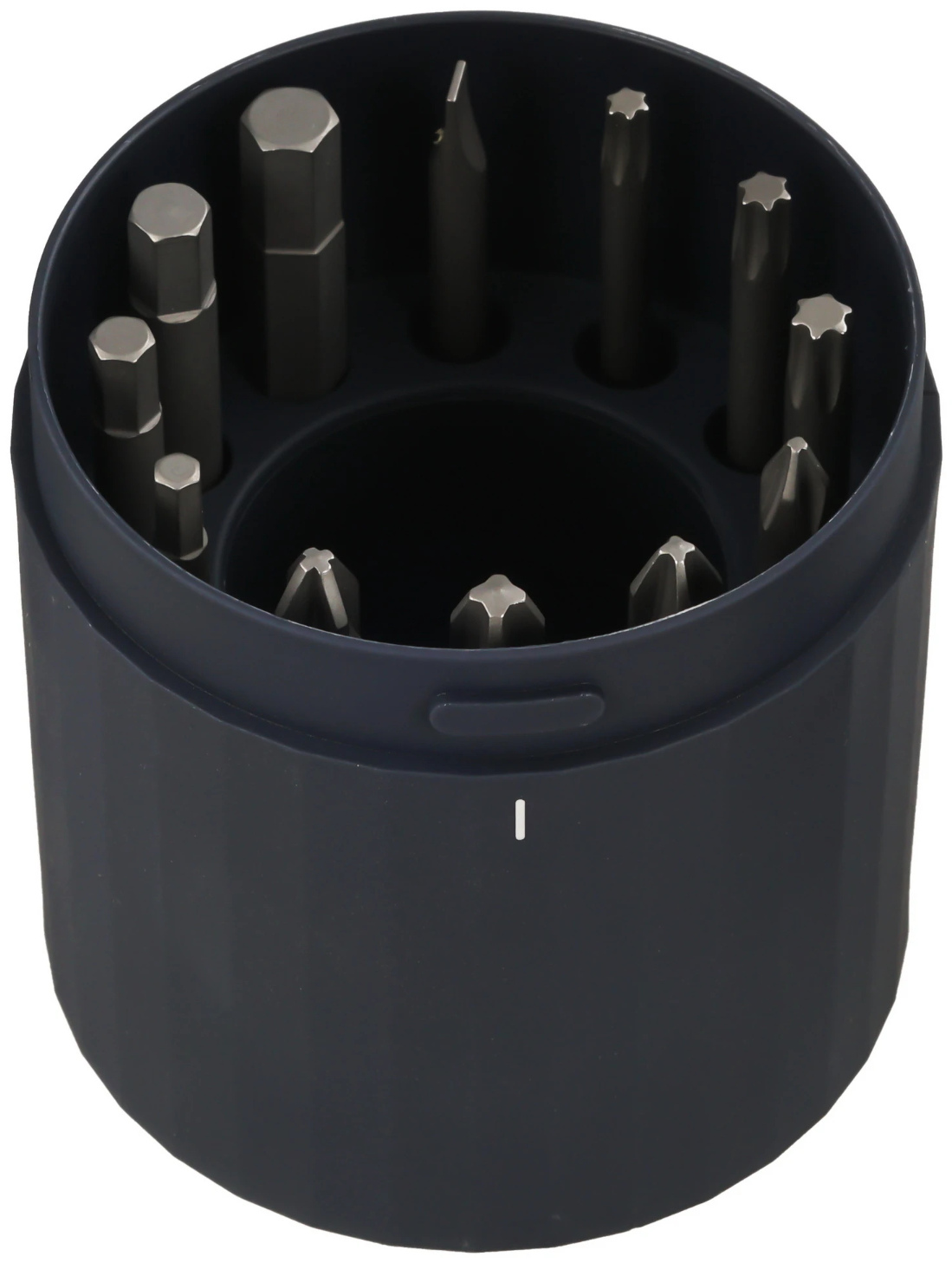 В набор входят отвертка и 12 бит: SL4, PH1, PH2, PH3, PZ2, T15, T20, T25, H3, H4, H5, H6. Это универсальный комплект для работы с различными типами крепежа.