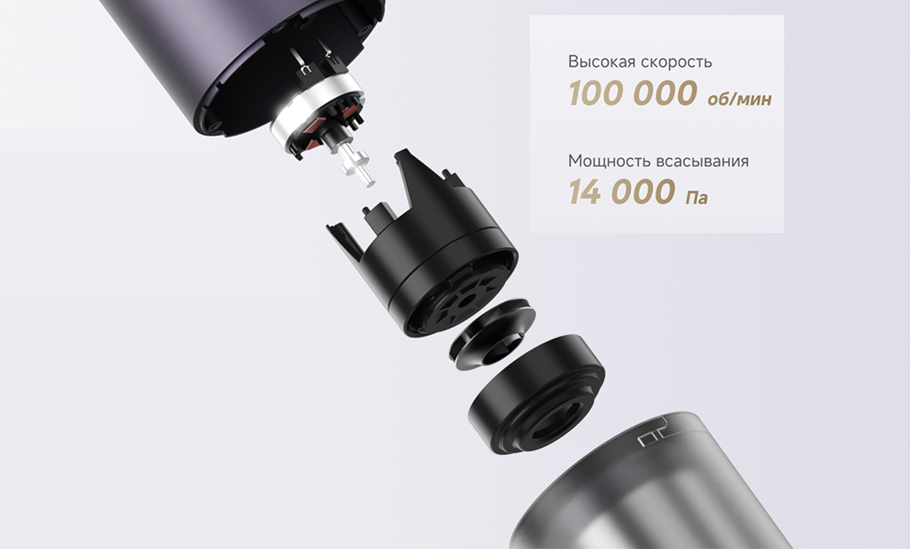 Устройство обеспечивает силу всасывания до 14 000 Па. Этого достаточно для удаления пыли, крошек и волос с гладких поверхностей. Скорость двигателя достигает 100 000 об/мин, что дает стабильную тягу на обоих режимах работы. Регулятор мощности расположен на корпусе, поэтому переключение выполняется быстро и удобно.