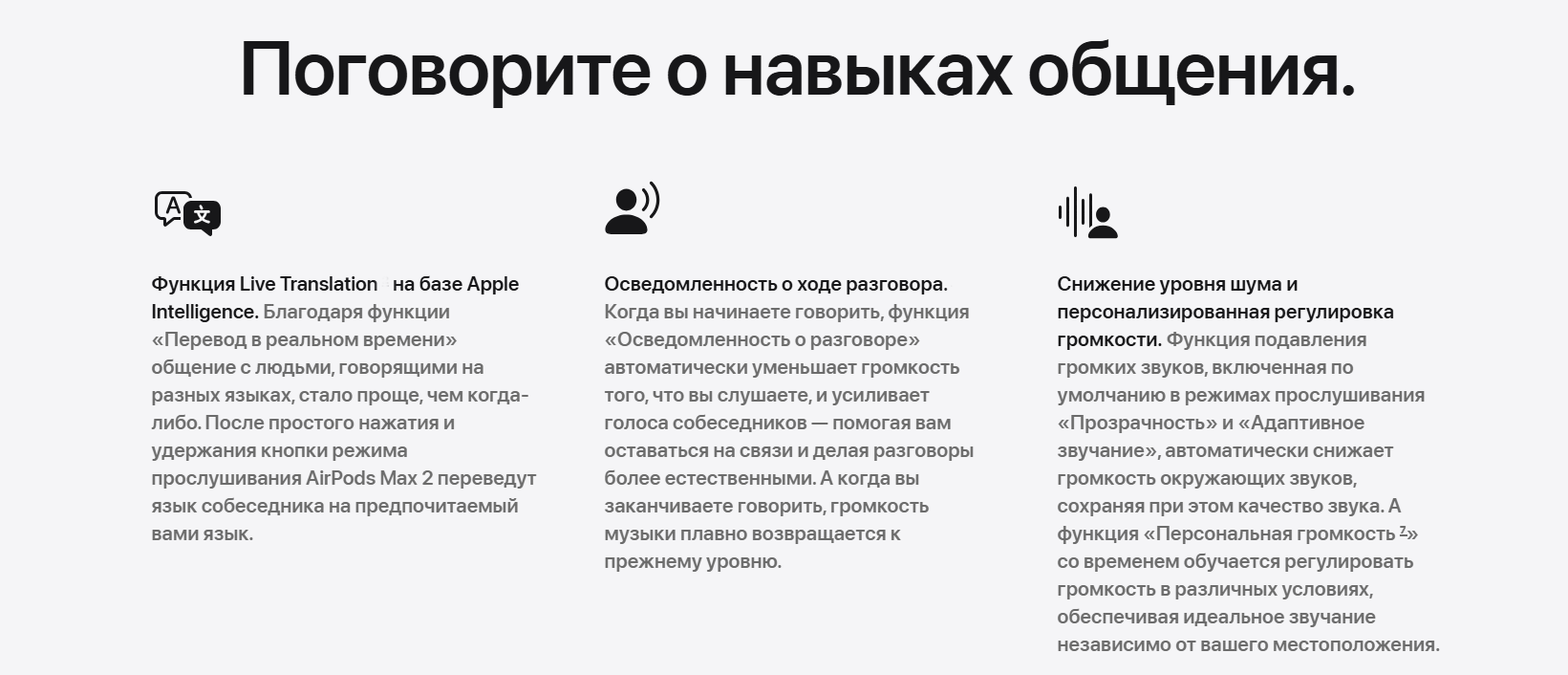 | Особенности, дополнительно | ИИ-переводчик, пространственный звук с динамическим отслеживанием положения головы |