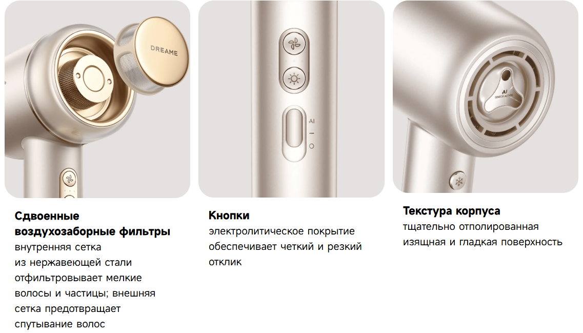 Dreame Gusto High-speed оснащён мотором со скоростью до 110 000 об/мин и мощностью 2000 Вт. Высокая производительность обеспечивает быструю сушку волос без лишних затрат времени.