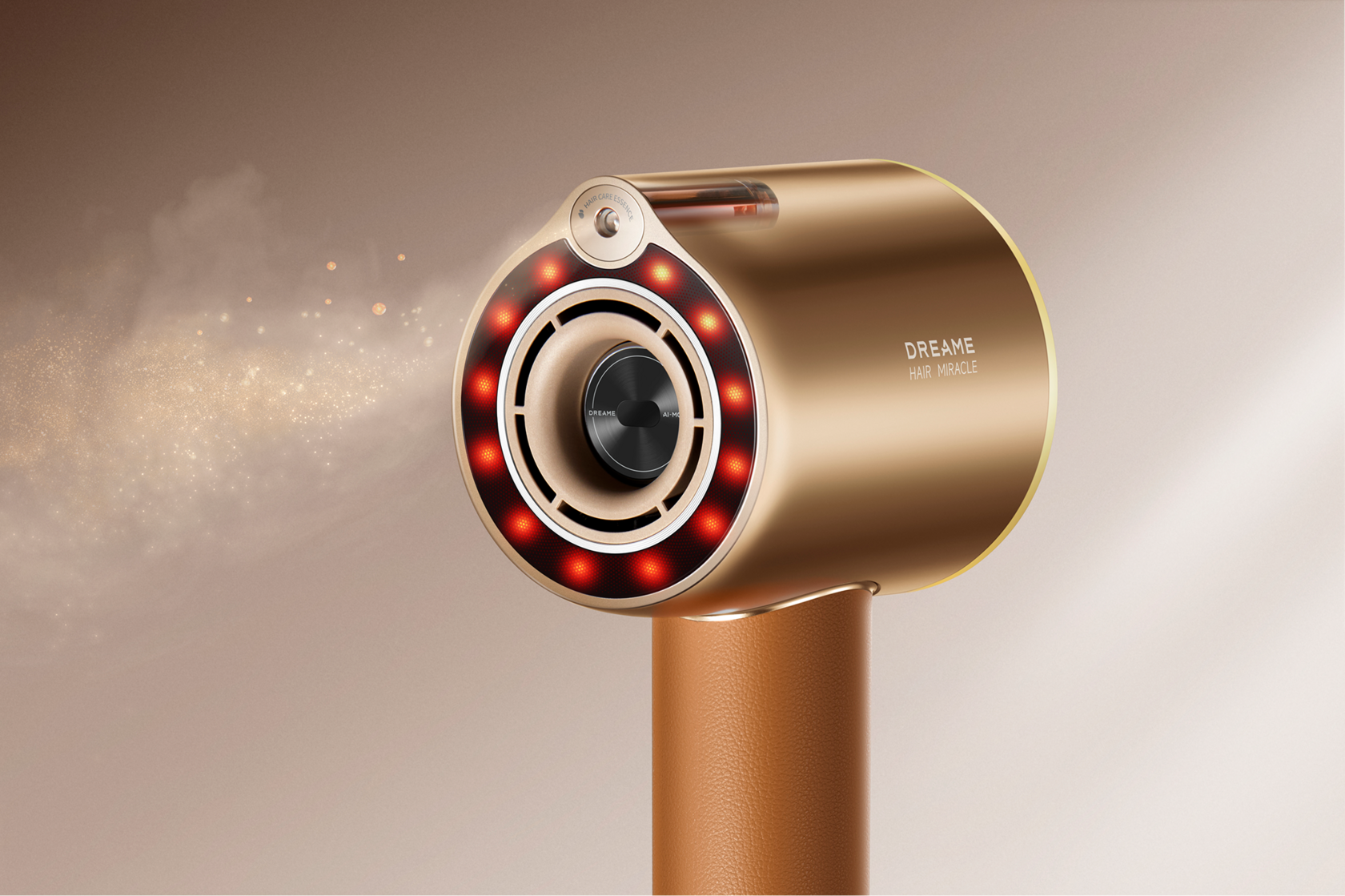 Фен Dreame Hair Dryer Miracle Pro High-speed создан как инструмент класса люкс. Его золотисто-коричневый корпус с матовым покрытием и гальваническим блеском выглядит изысканно, а эргономичная форма делает устройство удобным даже при длительном использовании. В комплект входит кожаный кейс и четыре магнитные насадки, каждая из которых автоматически распознаётся феном и запоминает последние настройки. Это не просто аксессуар для ухода, а полноценный профессиональный инструмент, созданный с вниманием к деталям.
