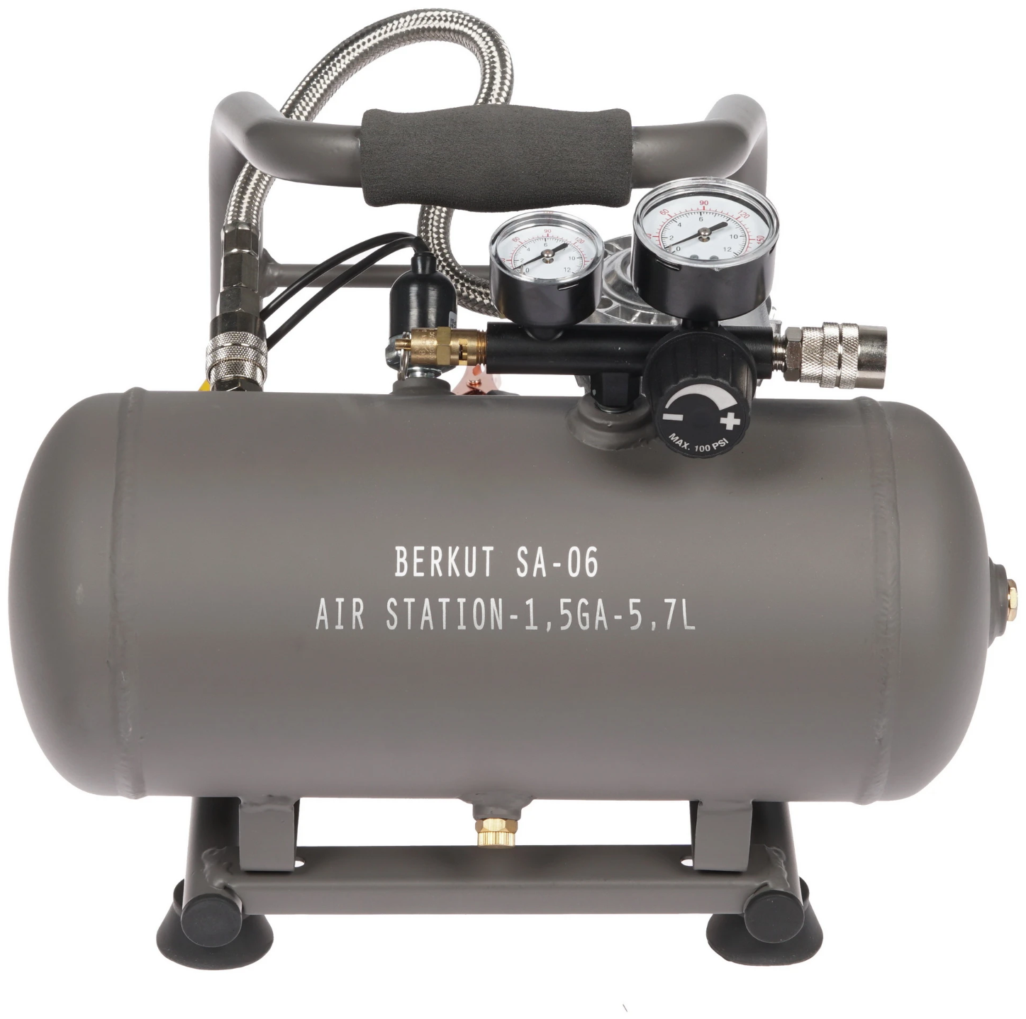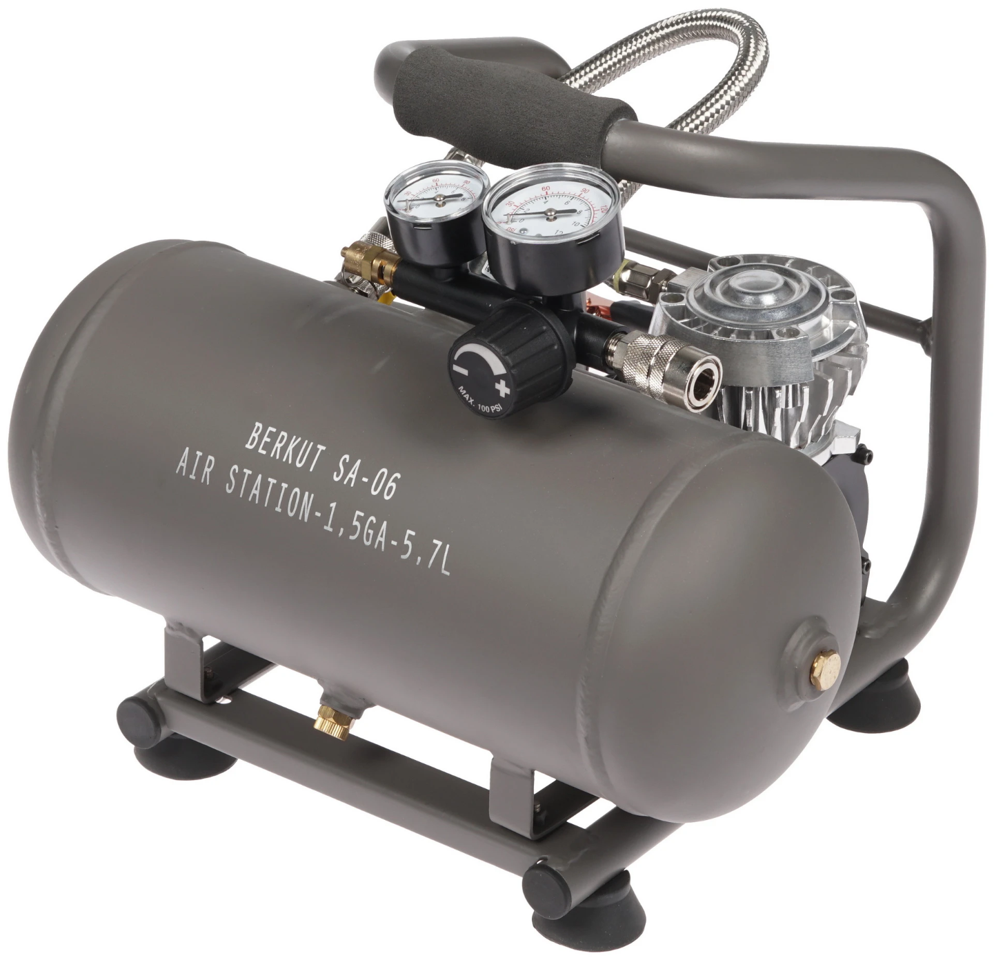 Berkut SA-06 выполнен в формате стационарного автомобильного компрессора с прочной стальной рамой и удобной ручкой для переноски. Корпус рассчитан на интенсивную эксплуатацию, а стальная оплётка шланга повышает износостойкость и надёжность при высоком давлении. Масса 10,6 кг и крупные габариты подчёркивают профессиональный класс устройства.