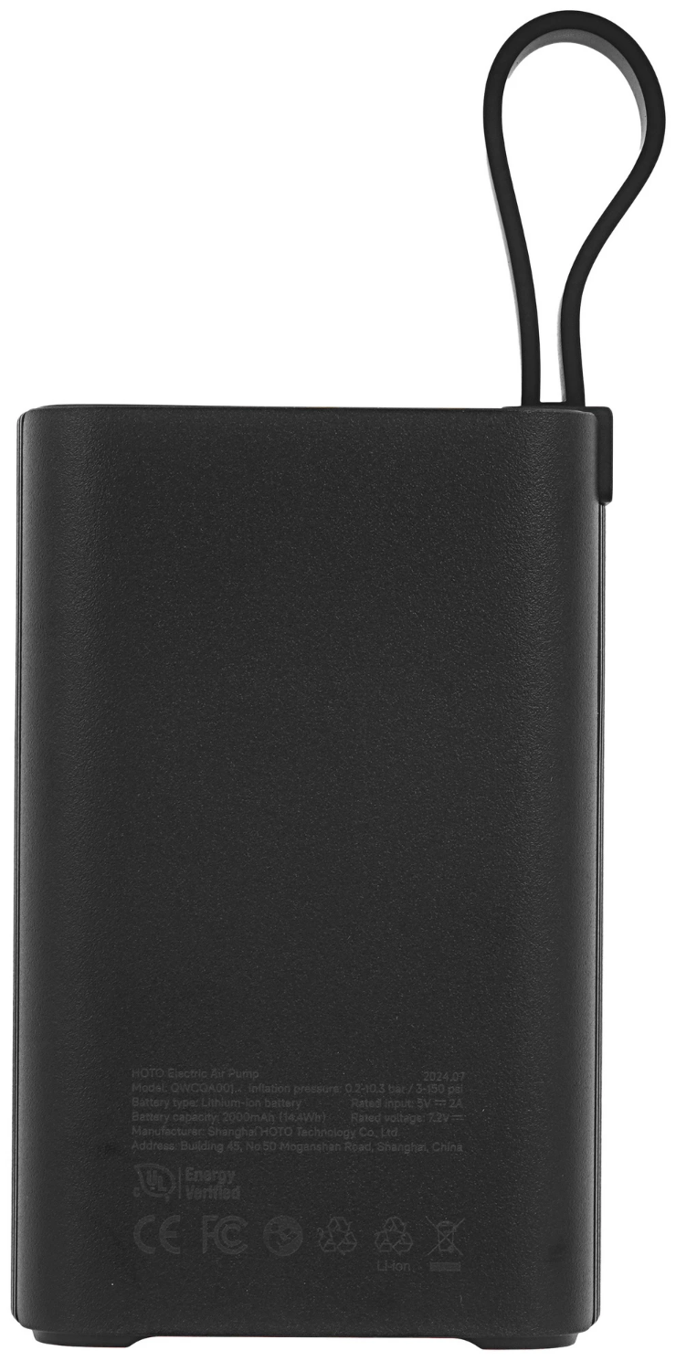 HOTO Air Pump работает от встроенного аккумулятора ёмкостью 2000 мА·ч и не требует подключения к розетке во время использования. Питание осуществляется при напряжении 5 В, а компактный кабель длиной 0,2 м используется для подзарядки устройства. Такой формат удобен для экстренных ситуаций в дороге.