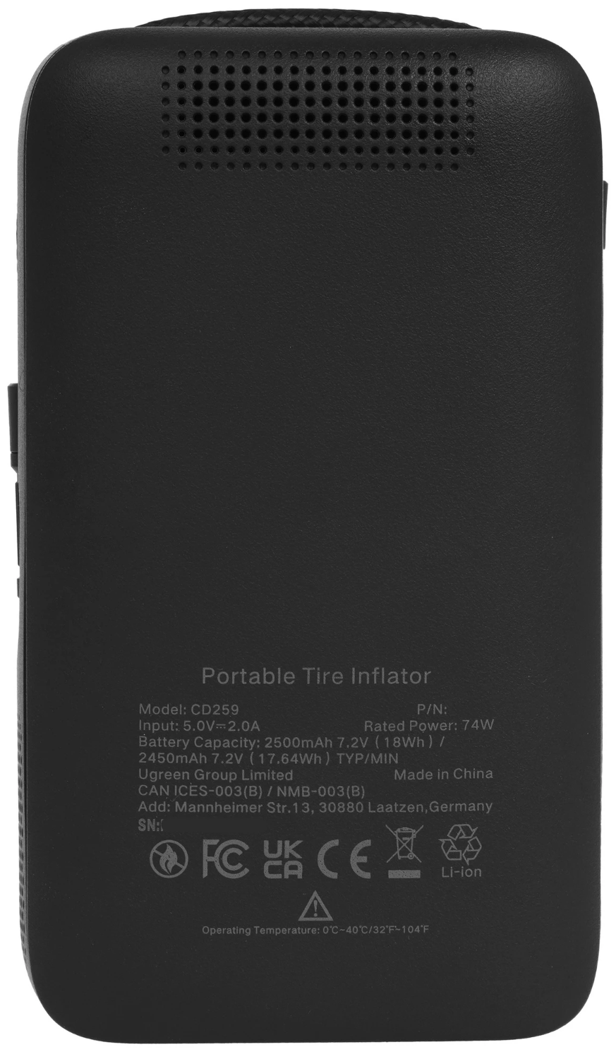 UGREEN CD259 Portable Tire Inflator выполнен в компактном чёрном корпусе и рассчитан на удобное использование в дороге и дома. При габаритах 7,8 × 13,5 × 4,88 см и весе 480 г компрессор легко помещается в рюкзаке, бардачке или нише автомобиля. Манометр расположен прямо на корпусе, что позволяет сразу контролировать давление без дополнительных устройств.