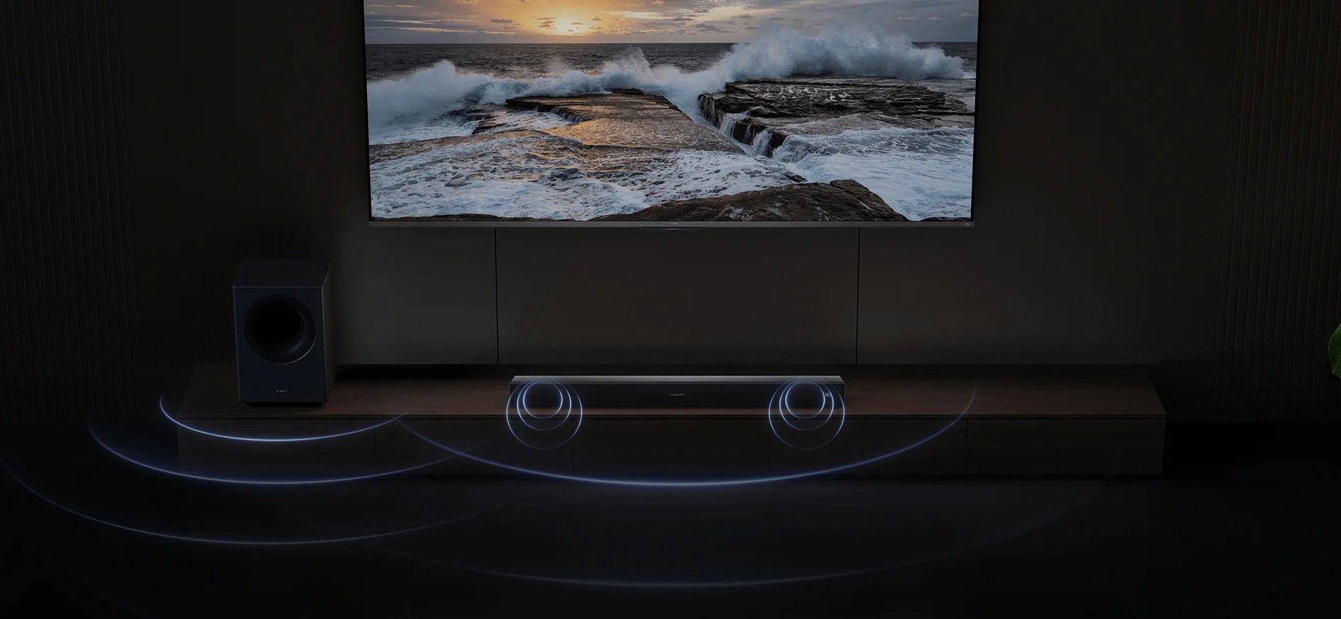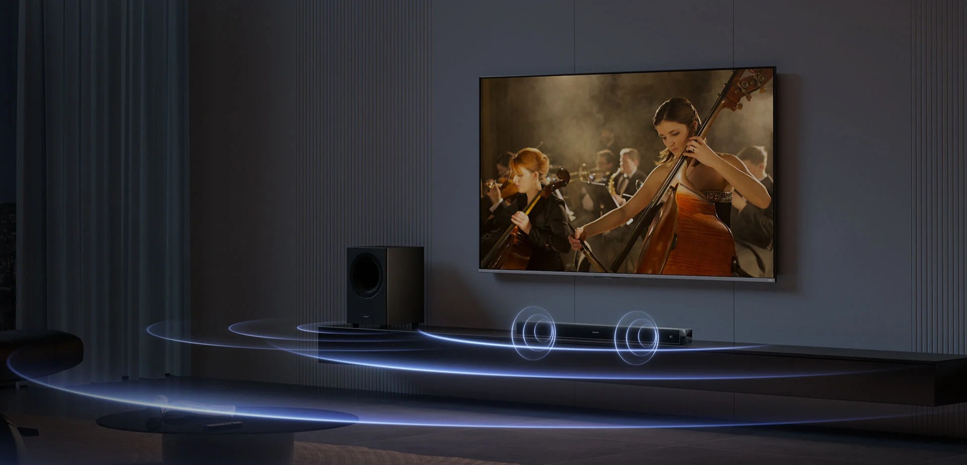 Система построена по схеме 2.1: два фронтальных динамика в панели и отдельный сабвуфер. Совокупная мощность достигает высокой громкости и уверенно заполняет звук в комнате. Сабвуфер обеспечивает плотный, насыщенный низкочастотный диапазон, что делает фильмы и музыку более выразительными. Поддержка Dolby Audio и DTS Virtual:X повышает объёмность звучания: голоса становятся чётче, эффекты — реалистичнее, а сцена — шире. Благодаря этому саундбар отлично подходит как для фильмов, так и для игр и концертных записей.