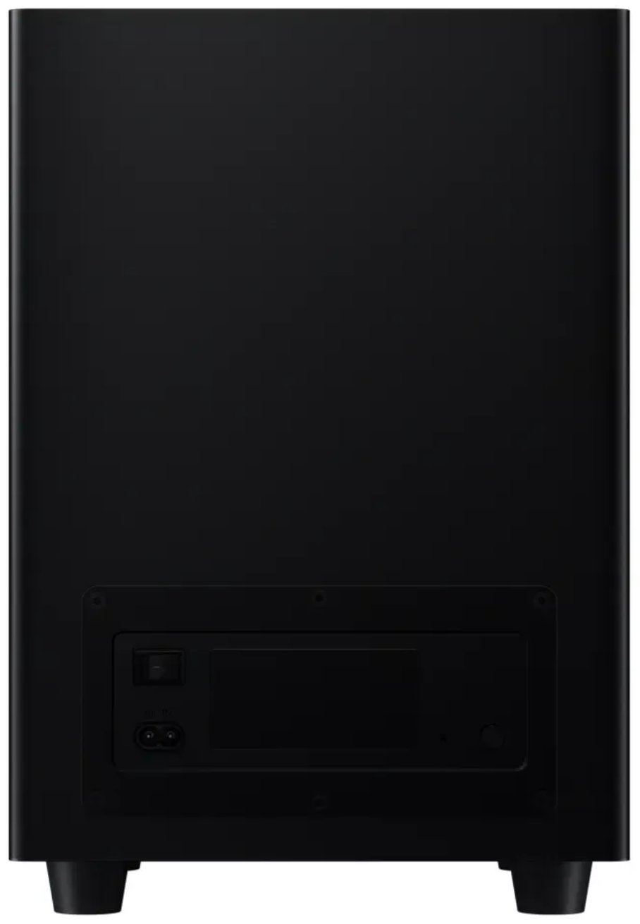 Xiaomi Soundbar Pro 2.1 выполнен в строгом чёрном цвете и выглядит современно благодаря металлической передней решётке и аккуратному минималистичному корпусу. Основная панель имеет высоту всего около шести сантиметров, поэтому она не перекрывает нижнюю часть экрана и легко помещается под телевизором. Ширина в 84 см позволяет саундбару выглядеть гармонично под моделями среднего и крупного размера. В комплект входит беспроводной сабвуфер — он создаёт глубокий бас и при этом может быть установлен в любом удобном месте комнаты, не перегружая пространство проводами.