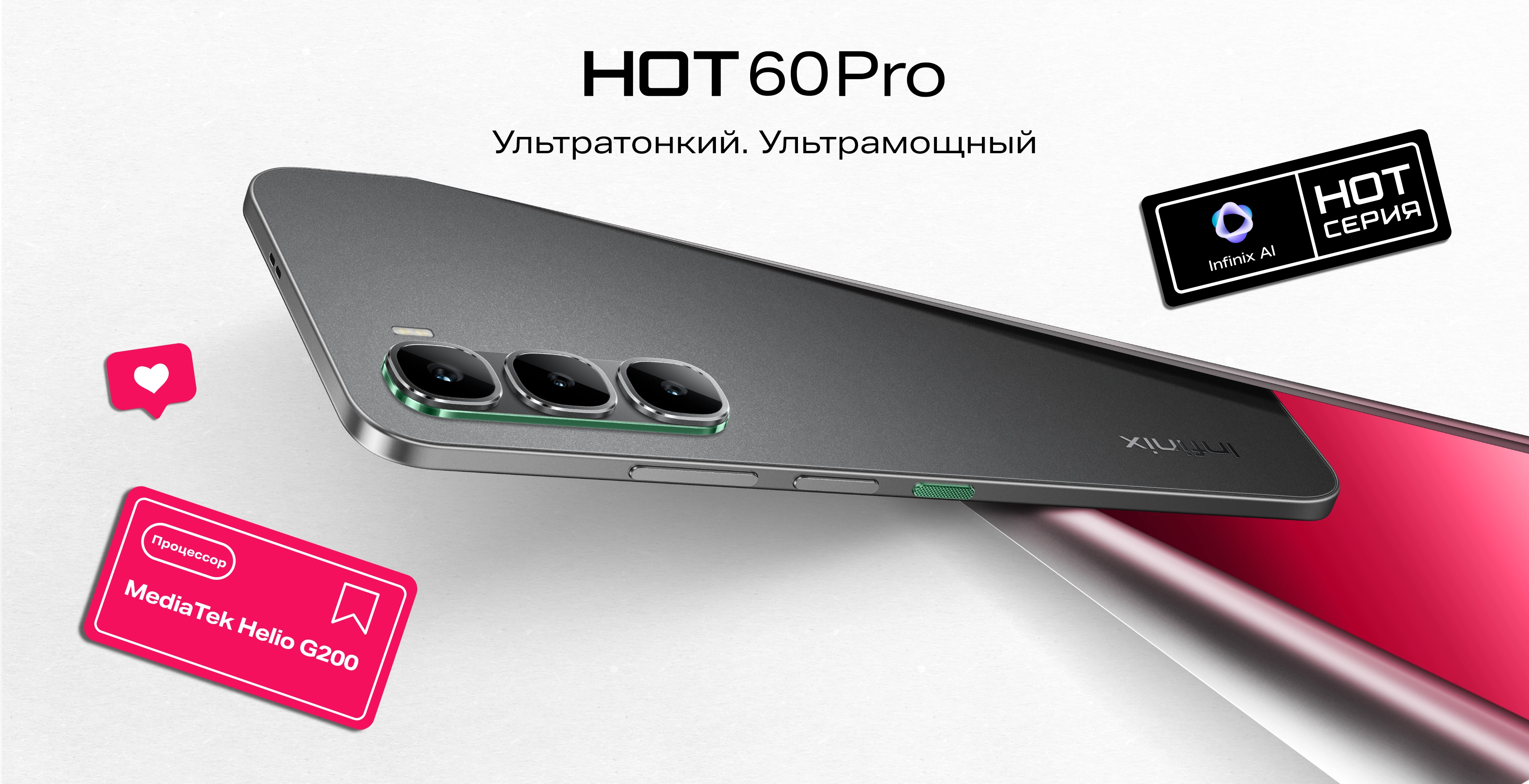 Infinix HOT 60 Pro получил тонкий корпус толщиной всего 6,6 мм и весом 170 грамм. Он выполнен из прочного пластика со стеклянной защитой Corning Gorilla Glass 7i. Благодаря эргономичной форме смартфон удобно держать в руке, а в продаже доступны разные цветовые решения, включая серебристый.