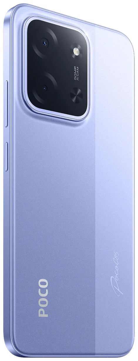 POCO C85 сразу обращает на себя внимание крупным 6.9-дюймовым экраном, заключённым в тонкий корпус толщиной всего 7.99 мм. Смартфон весит 205 г и удобно ложится в руку, несмотря на габариты. Задняя крышка выполнена из пластика со стеклянными элементами, а изящные переливы подчёркивают современный стиль устройства.