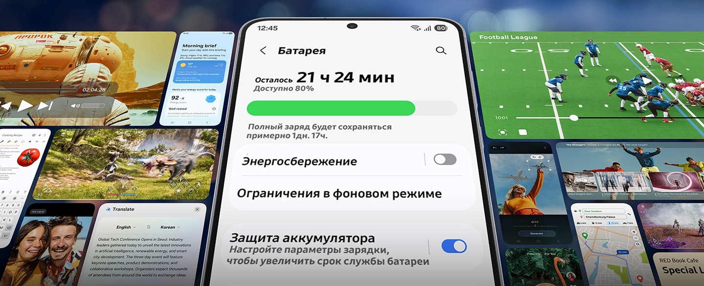 Батарея ёмкостью 4900 мА·ч выдерживает полный день активной работы и поддерживает быструю зарядку мощностью 25 Вт. Есть поддержка беспроводной и обратной зарядки, что позволяет восполнять энергию других устройств Galaxy — например, наушников или часов.