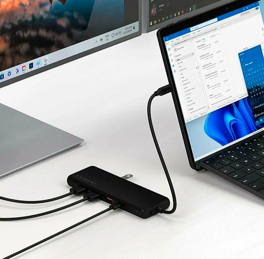 Разветвитель использует USB Type-C для подключения к компьютерам или ноутбукам, что позволяет легко подключать устройства с новыми портами. Он также поддерживает технологию Multi-Stream Transport (MST) для Windows, позволяя подключать несколько мониторов.