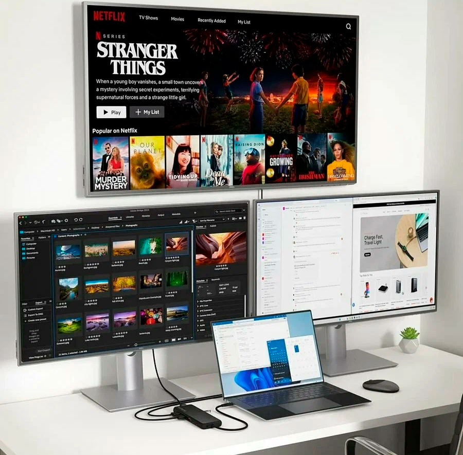 Разветвитель оснащен двумя HDMI-портами и одним DisplayPort, что позволяет подключить несколько внешних дисплеев и работать с несколькими экранами одновременно, что идеально подходит для работы или развлечений.