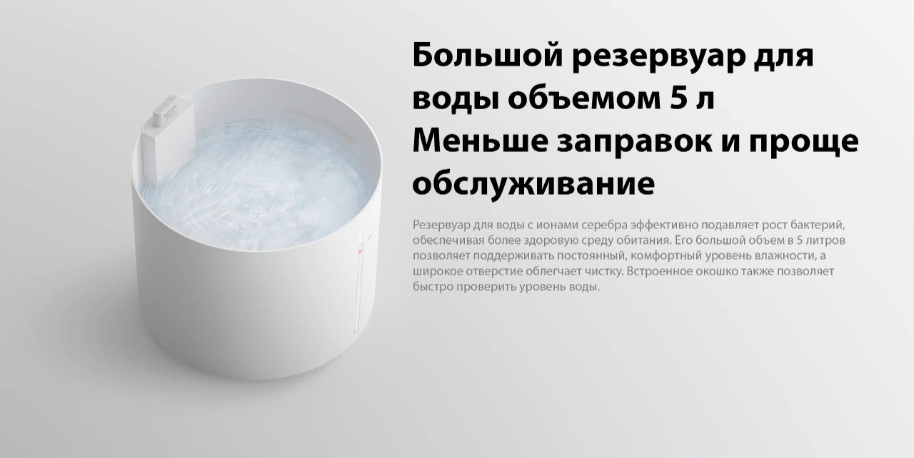 Объем бака 5 л позволяет устройству работать до 20 часов без перерыва. Верхний долив воды делает обслуживание простым и удобным — достаточно добавить воду, не разбирая корпус.