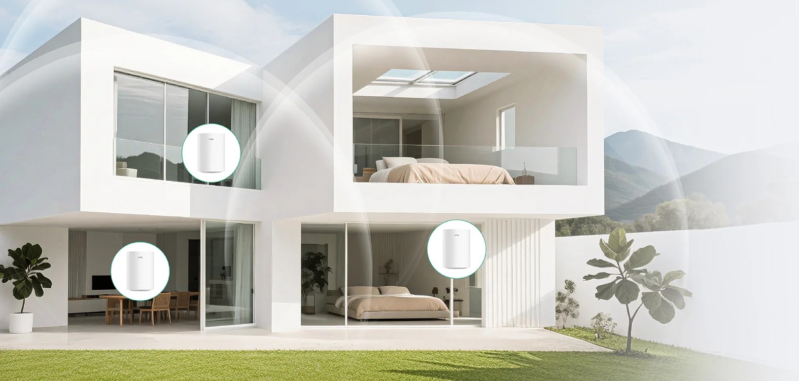 Два модуля работают как единая Mesh-система, обеспечивая бесшовное покрытие без разрывов связи при перемещении по дому. Это особенно удобно для квартир большой площади и частных домов.