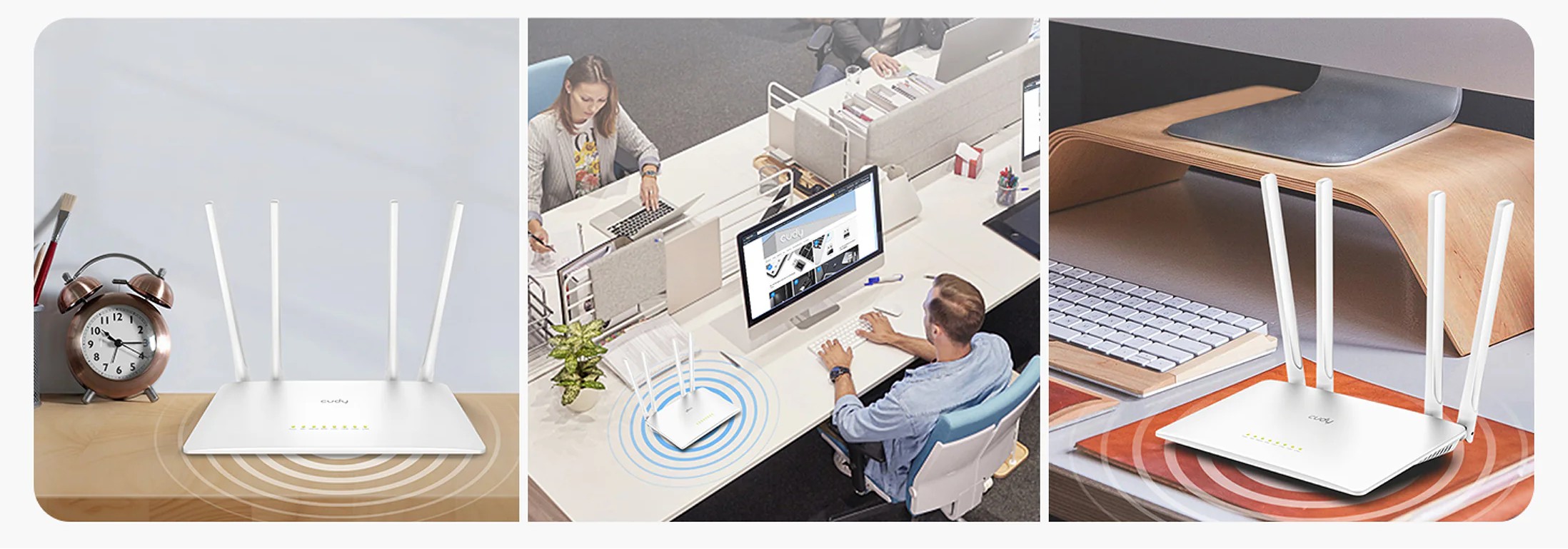 Четыре внешние антенны с усилением 5 dBi помогают обеспечить уверенный сигнал в нескольких комнатах. Это делает модель удобной для квартиры, небольшого дома или офиса.